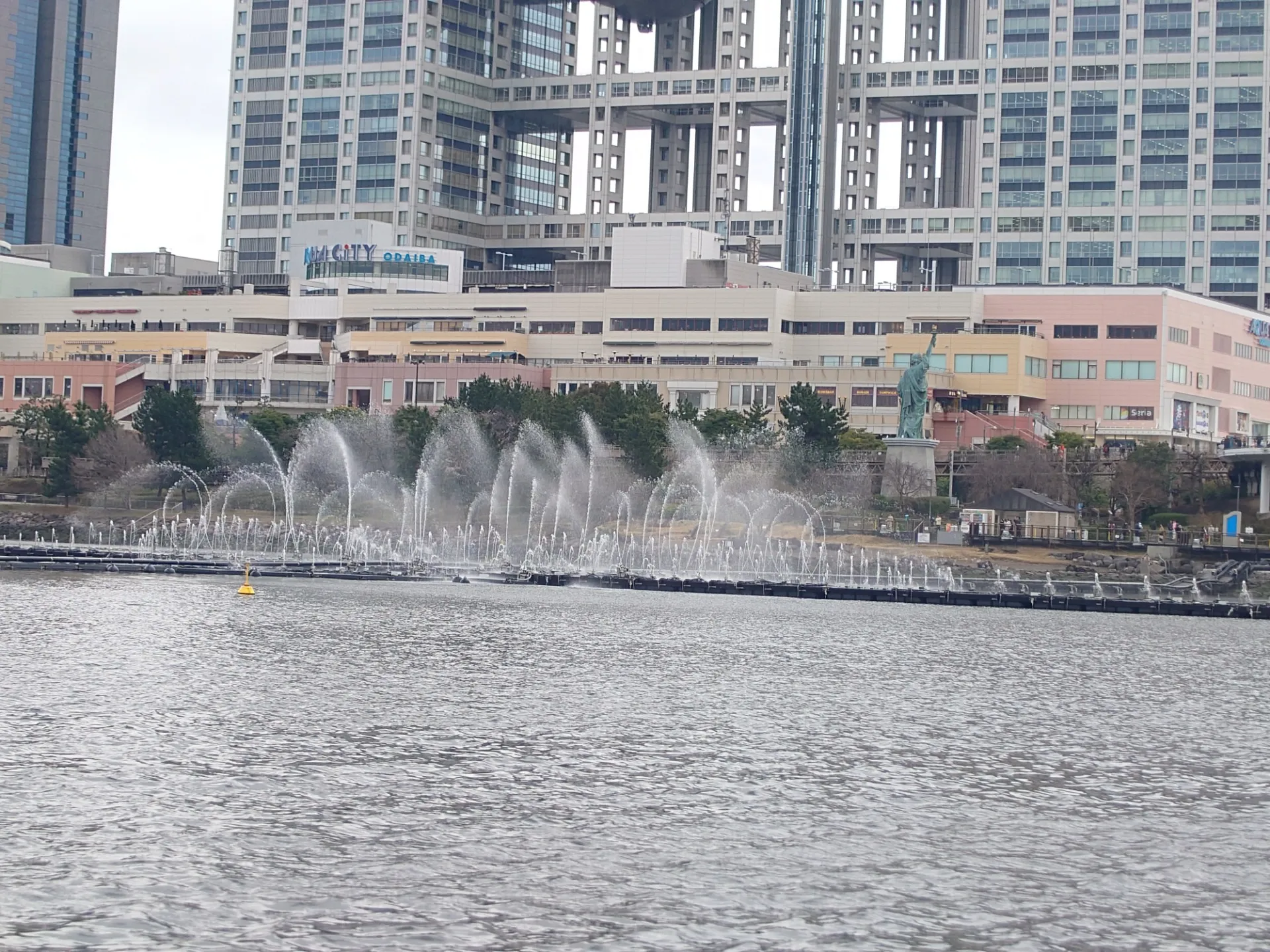そして、帰路につく頃にはさらなるサプライズが。 ちょうどお台場海浜公園の「海上噴水」の試験運用が行われており、船上からその迫力ある姿を間近に眺めることができました!