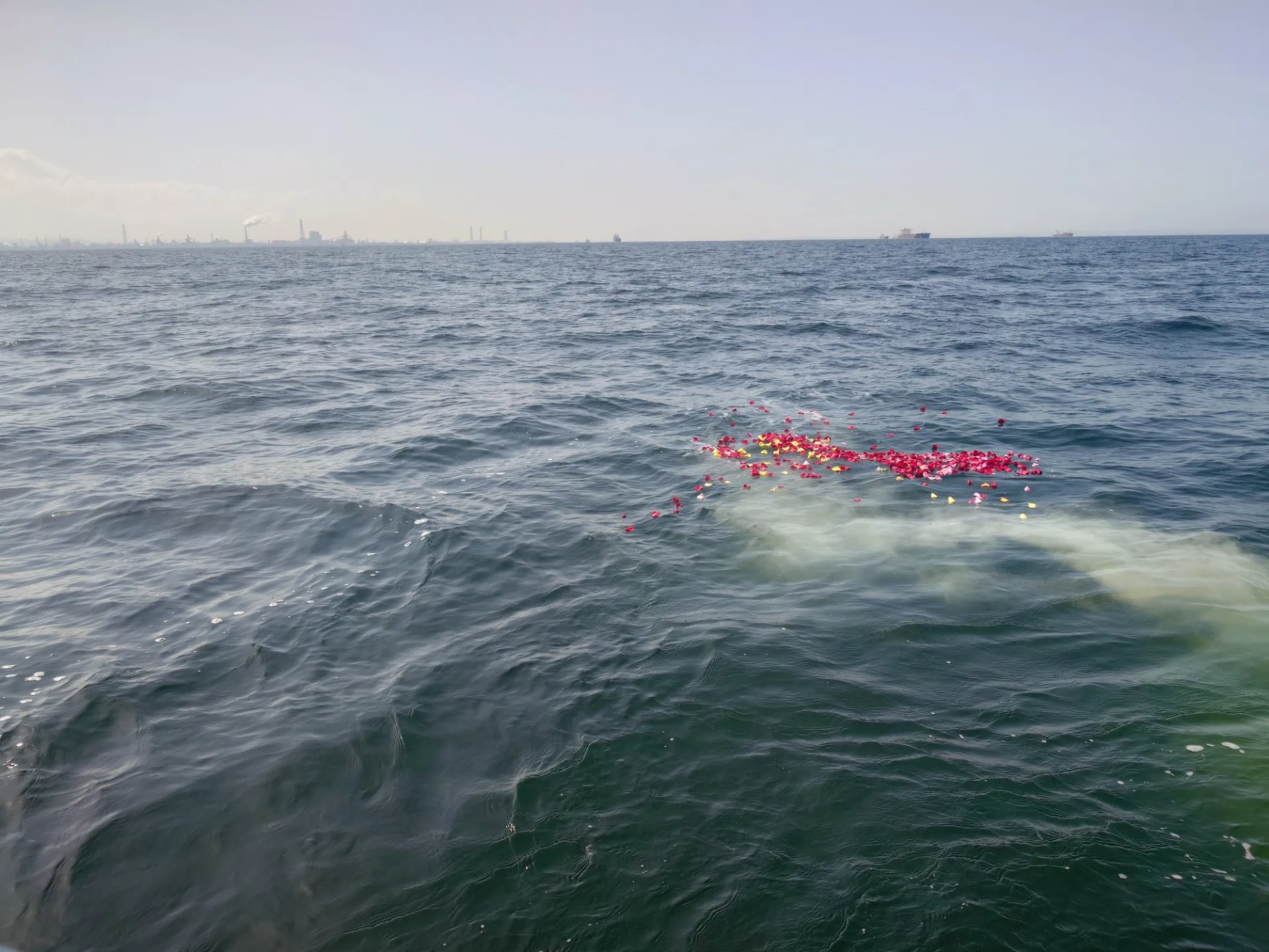 K様ご家族は、時折空を舞う飛行機を眺めながら、故人様との思い出を語り合っていらっしゃいました。「最後はこんなに晴れて良かったね」というお言葉通り、穏やかな波間に、色鮮やかな献花がいつまでも漂い、まるで故人様が皆様に手を振っているかのような、温かなお別れのひとときとなりました。
